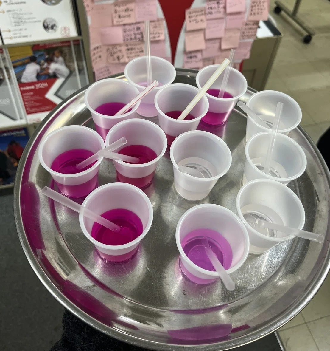 次に、HIVの感染力について理解を深めるための「水の交換実験」が行われました。コップに入った水を3回、異なる人と2滴ずつ交換し、最後に試薬を加えた時の水の色の変化から知らぬ間に感染してしまったり、誰かを感染させる可能性があることを知ってもらう実験になります。わずかな量の水でも色が変化したことで、気づかないうちに感染したり、周囲へ広めてしまうおそれがあることを実感することができました。参加者の方々はその変化にとても驚いていたようで、実際に体験することで理解がより深まった様子でした。