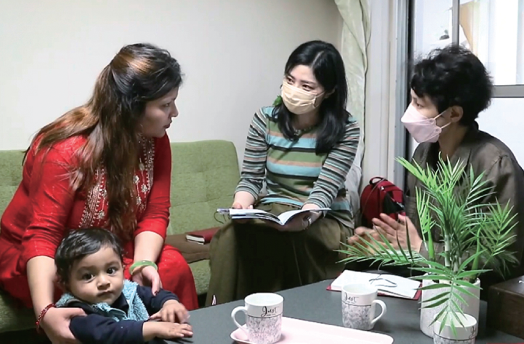 外国人の家庭を訪問中の保健師と医療通訳者