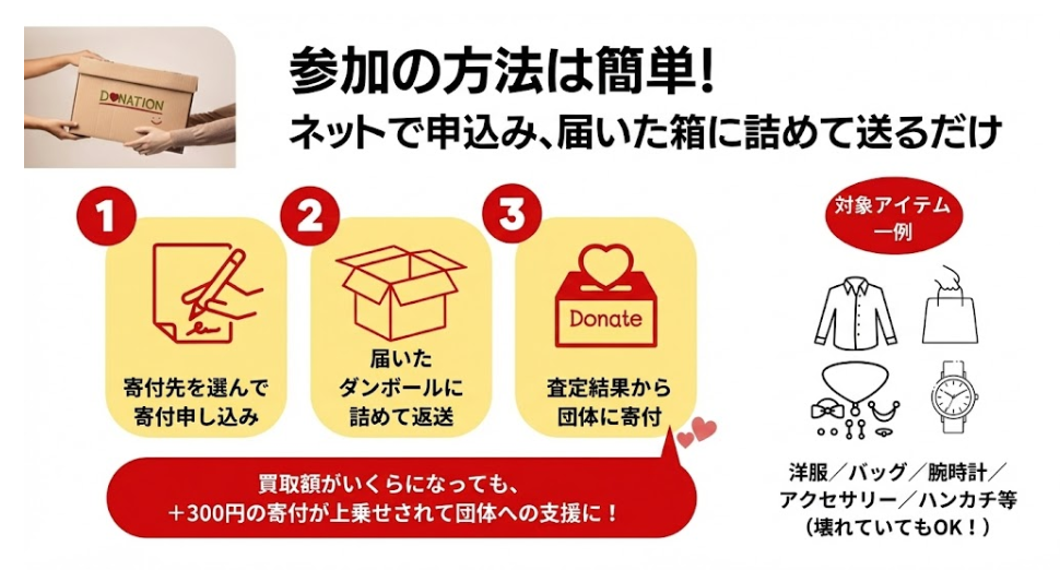 軽度の使用感や小さなシミ・ほつれ程度であれば、寄付可能な場合があります。「これは大丈夫かな?」と迷うアイテムがあっても、まずは送ってみることをおすすめします。査定額が0円でも、300円の上乗せ寄付が発生するため、無駄になることはありません。